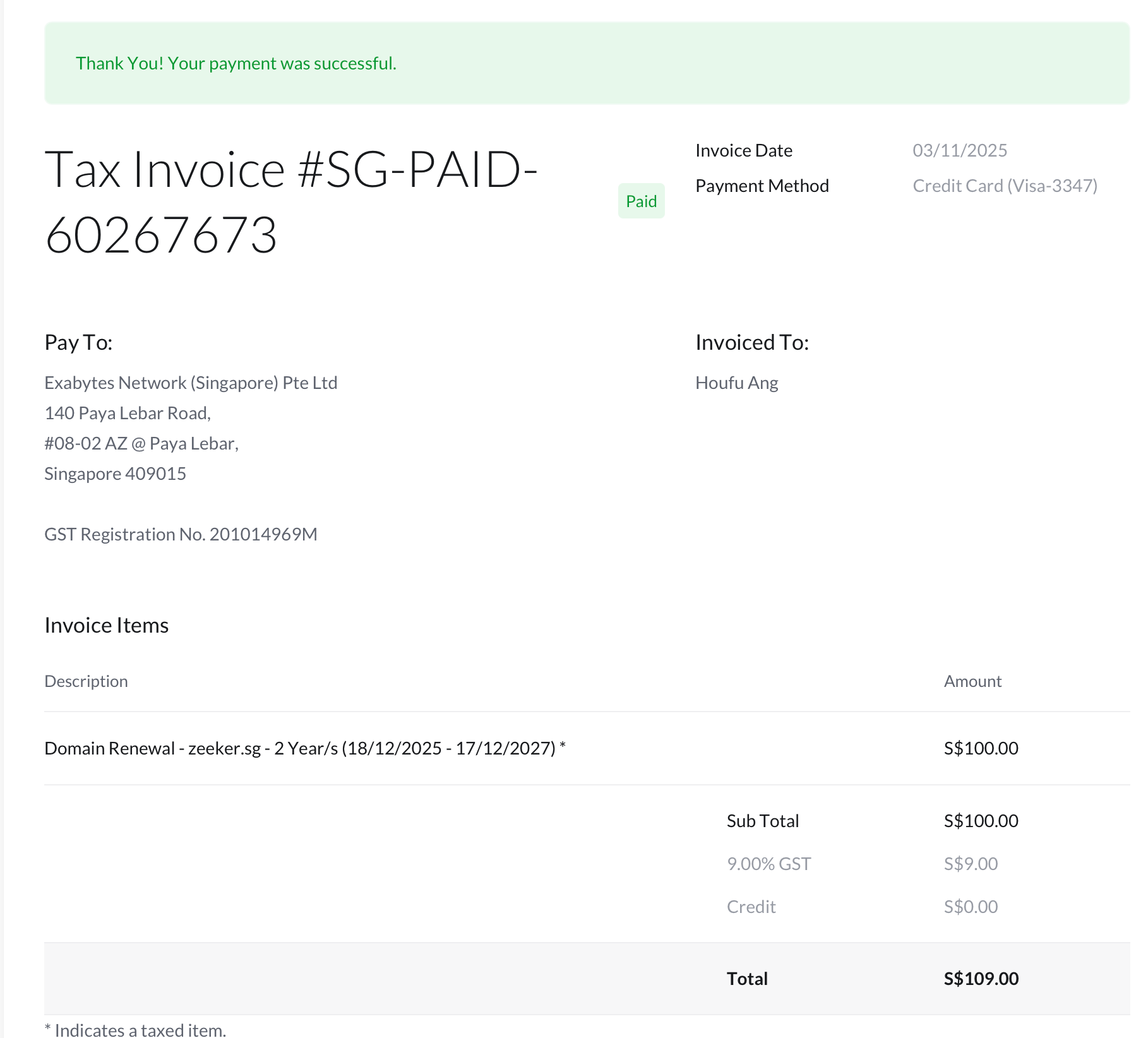 My domain renewal invoice arrived last week. Another two years of zeeker.sg: $110.