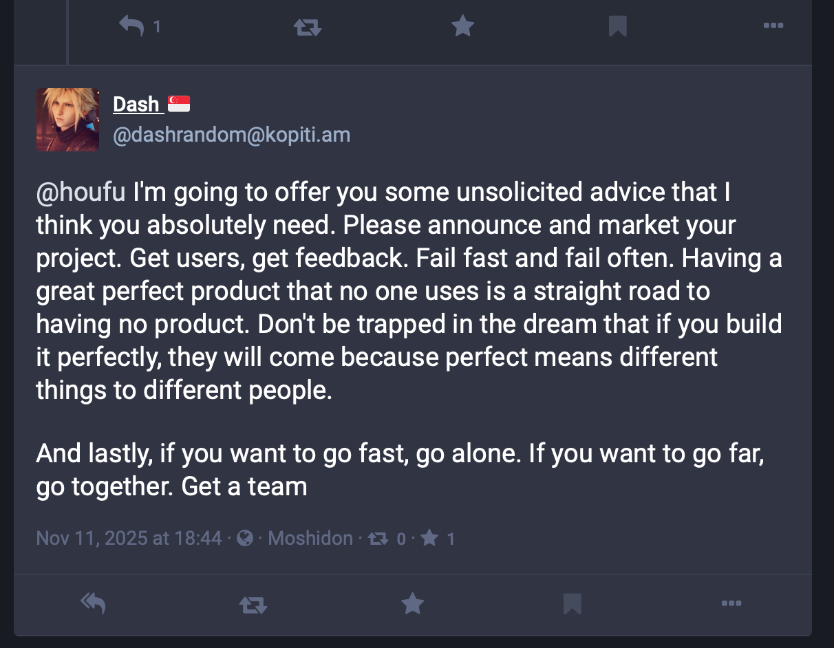 The Mastodon advice ended with "if you want to go far, go together. Get a team."