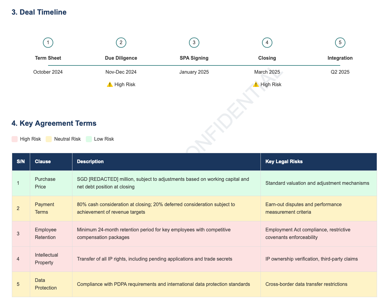 The output of this section is a table with 4 columns: S/N, Clause, Description and key Legal Risk. Add a row for each key agreement term, and include all of them in the table. Color code the entire row based on the risks levels: Red (High Risk), Yellow (Neutral), Green (Low Risk). Add a legend to describe the color coding used. - You might not get it right the first time. (I learned this building CLI tools that AI agents actually use—AI doesn't always work the way you expect.) Think carefully about what you might be missing. If you're writing a web page, you may have to use web design language such as