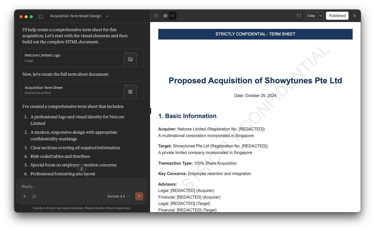 In 2024, I spent hours crafting a 3-page prompt to generate an M&A term sheet for a legal tech competition. The result was a 4-page HTML document with timeline diagrams, color-coded risk tables (red/yellow/green), and professional typography that no standard Word template could match.